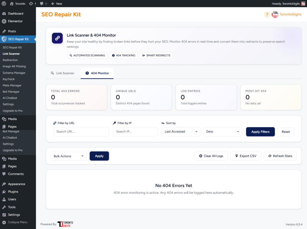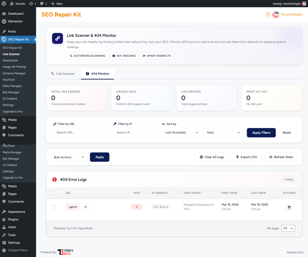 The 404 Monitor feature in the SEO Repair Kit plugin helps you detect and track 404 errors (Page Not Found) that occur on your website.