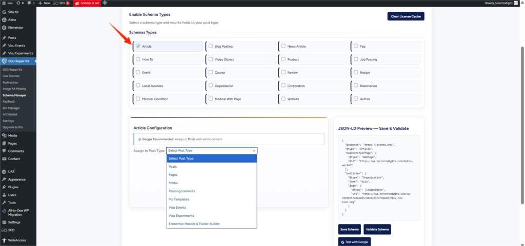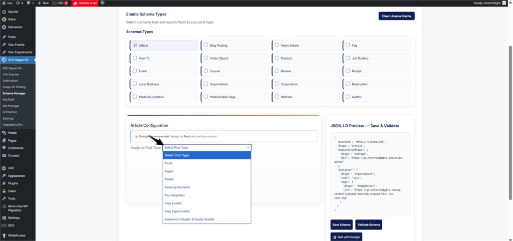 Step 3: Choose a Schema Type Click on “Add New Schema” or select an existing one. You’ll see 15+ supported schema types, such as: