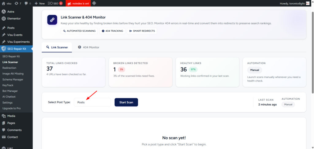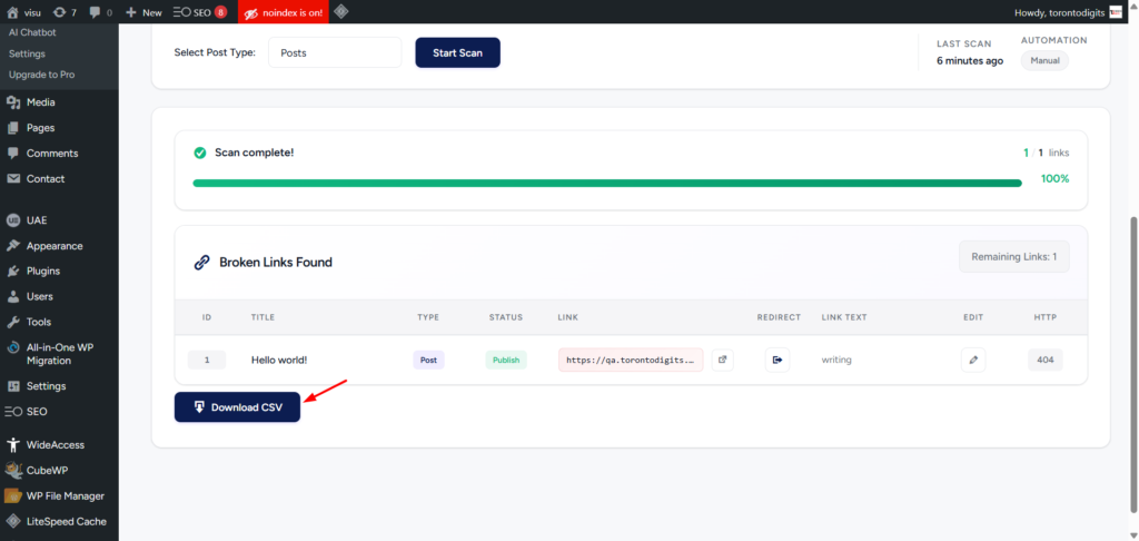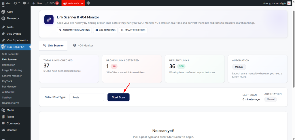 In addition to automated scans, you can manually trigger a scan at any time. This is especially useful after publishing new content or making major updates, ensuring broken links are caught immediately.