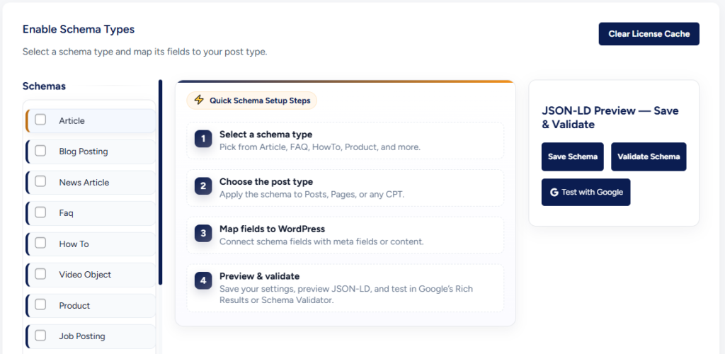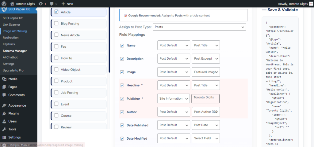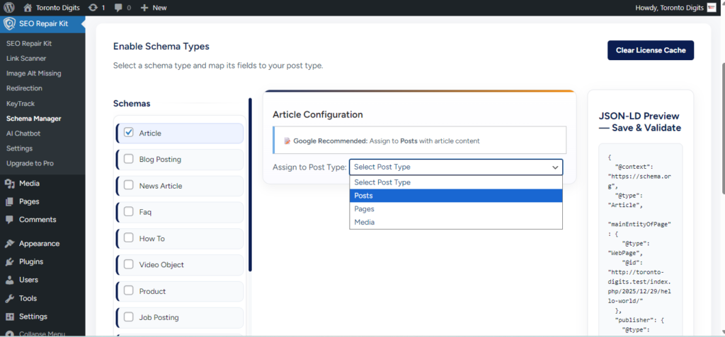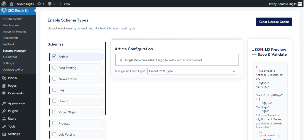 1- Go to WordPress Dashboard → SEO Repair Kit → Schema Manager